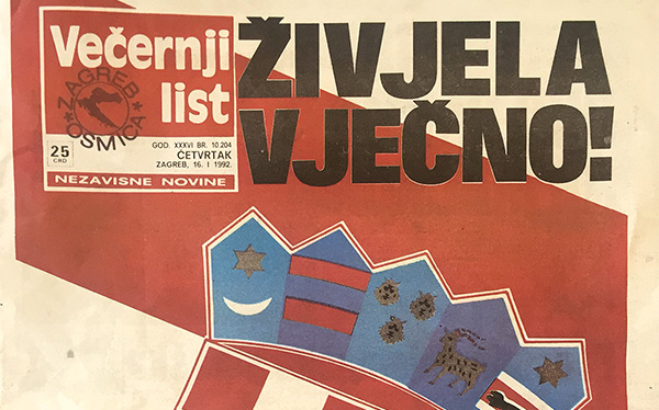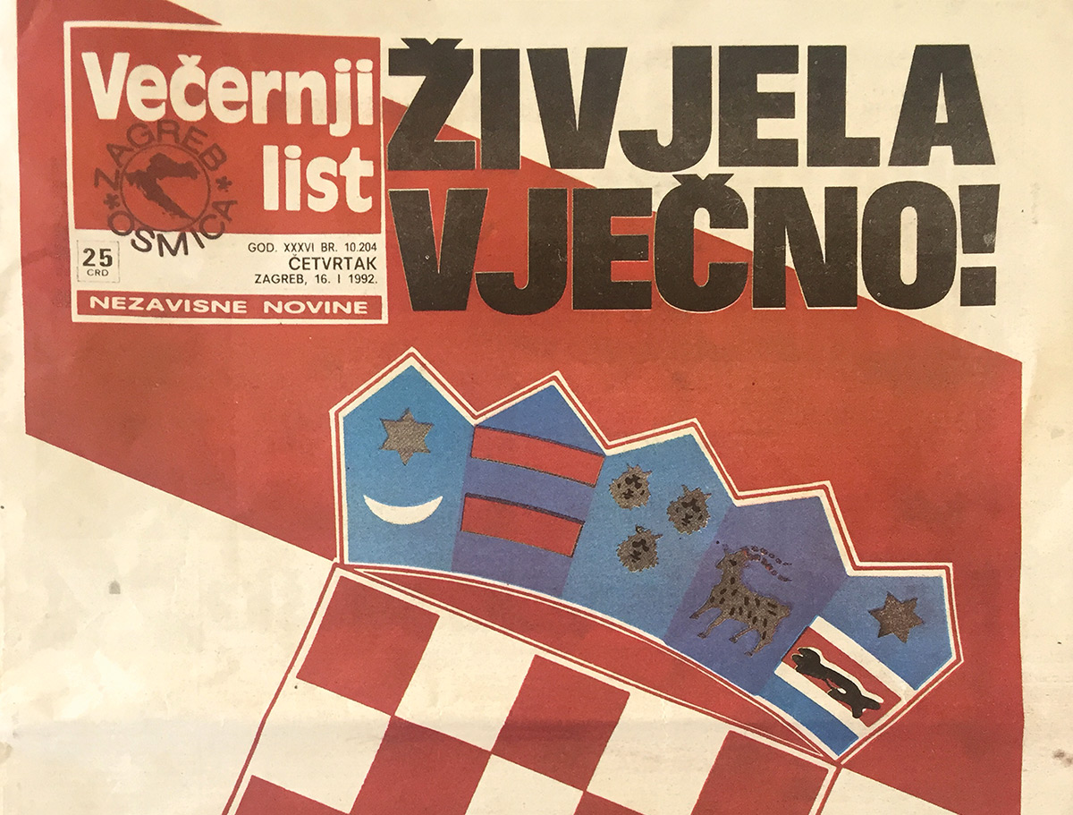 Alors que les forces croates enregistrent leurs premiers succès face à l'armée serbo-fédérale en Slavonie occidentale, la Croatie, tout comme la Slovénie, est reconnue comme État indépendant par la communauté internationale. Après l'Islande, le 19 décembre, puis le Vatican et Saint-Marin, les 13 et 14 janvier, l'Europe des Douze leur emboîte le pas le 15, de même que l'Autriche, la Bulgarie, le Canada, la Hongrie, Malte, la Norvège, la Pologne et la Suisse. Avant fin janvier, 44 pays reconnaîtront la Croatie comme État souverain. Le Maroc en fera de même dès le 27 avril 1992. Cette victoire diplomatique croate conduira à faire taire les armes, puisque le 15e cessez-le-feu, entré en vigueur le 2 janvier, tient enfin. Un quart de la Croatie est néanmoins occupé par les forces serbes et la ligne de front restera quasiment inchangée jusqu'au renversement stratégique de l'été 1995. (Photo : « Qu'elle vive à jamais! », la une du quotidien Večernji list du 16 janvier 1992.)