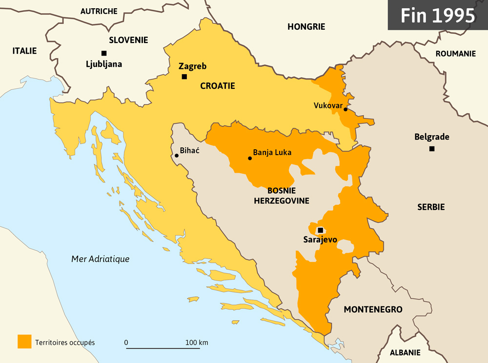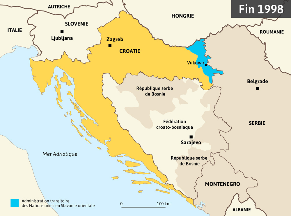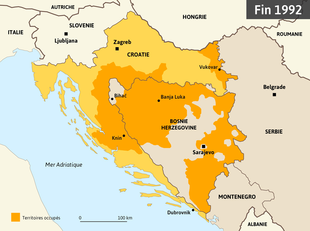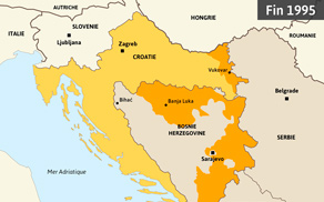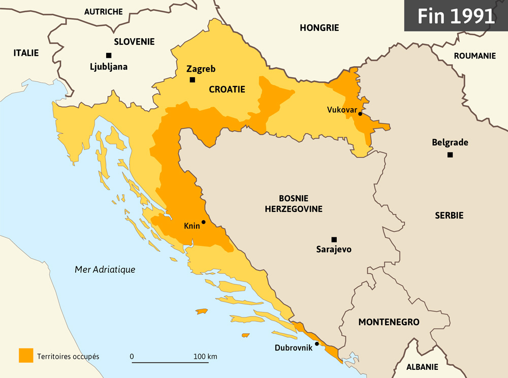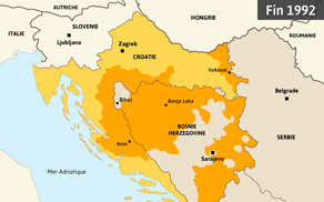 Après la Croatie, la Bosnie-Herzégovine sombre à son tour dans la guerre. Les séparatistes serbes y refusent le résultat du référendum sur l'indépendance, auquel Croates de Bosnie (18 % de la population) et Bosniaques (44 %) ont apporté un soutien massif, alors que les Serbes de Bosnie (31 %) l'ont boycotté. Avec l'aide de l' « armée fédérale », ils entament le siège de Sarajevo et s'emparent en six mois des deux tiers du pays, ce qui provoque le déplacement de 2 millions de personnes. Une situation qui va rendre plus difficile encore la situation militaire en Croatie en raison de l'étroite collaboration des séparatistes des deux pays. En 1995, l'armée croate, qui s'est entre-temps équipée, parviendra à libérer la majeure partie du territoire national et une grande partie de la Bosnie occidentale. Cela conduira aux Accords de paix de Dayton qui scelleront la fin de la guerre. Ce n'est toutefois qu'en janvier 1998, au terme d'une transition supervisée par l'ONU, que l'ensemble du territoire croate sera réunifié, lorsque Zagreb reprendra pacifiquement possession de la Slavonie orientale et de la ville de Vukovar.
