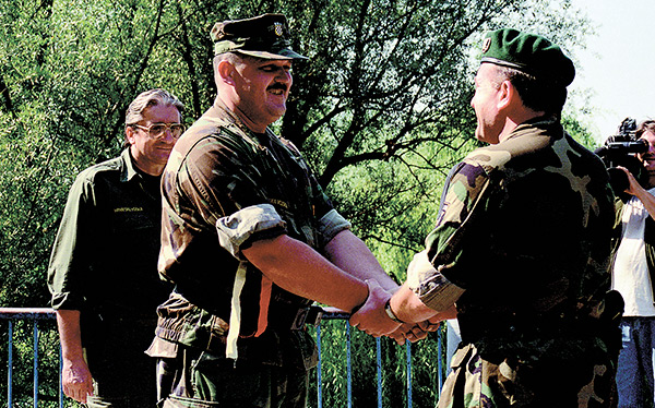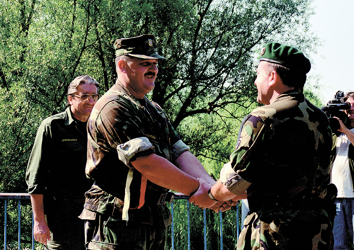 Au deuxième jour de l'opération « Tempête », l'armée croate atteint la frontière croato-bosniaque et fait la jonction avec les forces bosniaques à Bihać, mettant ainsi fin au calvaire des 230 000 Bosniaques assiégés depuis 1201 jours dans cette « Zone de sécurité » de l'ONU. Pilonnée par les Serbes et sur le point de tomber, la ville risquait de subir le même sort que Srebrenica, un mois auparavant. À la frontière, le général bosniaque Atif Dudaković (à droite) accueille et remercie le général croate Marijan Mareković, qui a conduit les opérations. Jusqu'à fin septembre, les opérations conjointes croato-bosniaques vont permettre de libérer de vastes territoires en Bosnie occidentale, ouvrant la voie à la fin de la guerre.
