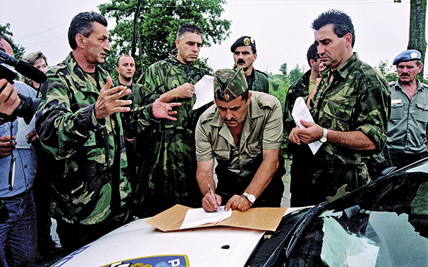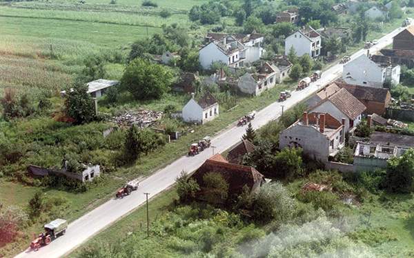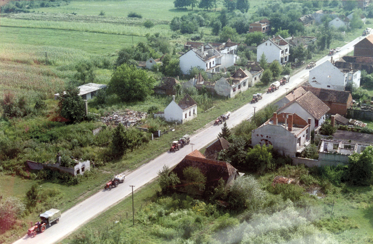 En dépit des appels radiodiffusés du président croate exhortant la population serbe des territoires libérés à ne pas quitter la Croatie, leur patrie, plus 90 000 civils et 30 000 paramilitaires partent pour la Bosnie et la Serbie en convoi, répondant ainsi à l'ordre d'évacuation des leaders séparatistes serbes, qui, selon des plans préétablis, organisent et encadrent l'exode. Seuls 10 000 Serbes décident de ne pas quitter leurs foyers. Quant à la majeure partie du territoire croate, qui n'a pas été occupé, on y compte plus de 100 000 Serbes qui, tout au long de la guerre, ont partagé le sort de leurs concitoyens croates. Dans les années qui suivront, le gouvernement croate financera la reconstruction d'environ 150 000 logements dans les zones dévastées, si bien qu'une partie des Serbes de Croatie fera le choix de revenir. (Photo: convoi de civils serbes quittant la Croatie en direction de la Bosnie, traversant ici un hameau croate près de Topusko, occupé et détruit en 1991.)