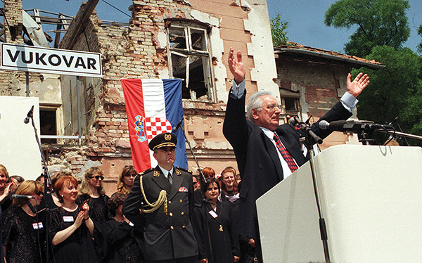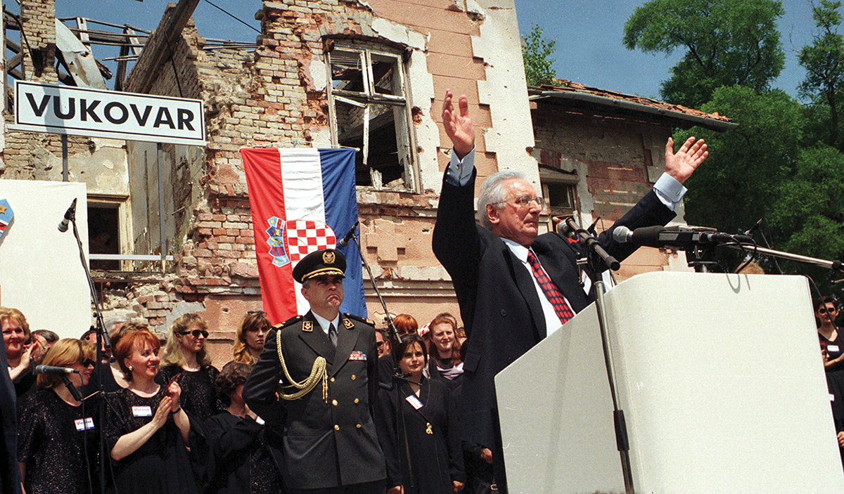 Si la majeure partie des territoires occupés a été libérée au cours de l'opération « Tempête » en août 1995, cela ne fut pas le cas de la Slavonie orientale, région frontalière séparée de la Serbie par le Danube. En vertu de l'Accord d'Erdut de novembre 1995, négocié à Dayton entre les présidents croate et serbe puis signé par Zagreb et les séparatistes serbes, le Conseil de sécurité de l'ONU a établi une Administration transitoire des Nations unies en Slavonie orientale (ATNUSO) ayant pour mandat d'accompagner le retour de cette région sous souveraineté croate dans un délai de deux ans. C'est dans ce contexte que le président Tuđman effectue un premier déplacement historique dans la ville martyre de Vukovar, symbole de la résistance croate et chef-lieu de cette région, dernière portion du territoire national manquant à la réunification entière du pays. (Photo : seconde visite du président croate à Vukovar, le 8 juin 1997, où il s'est rendu à bord du « Train de la paix ».)