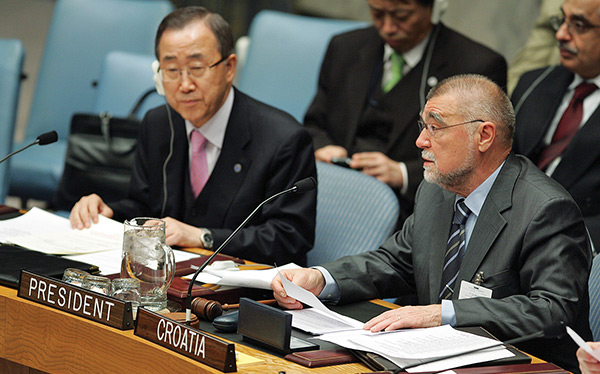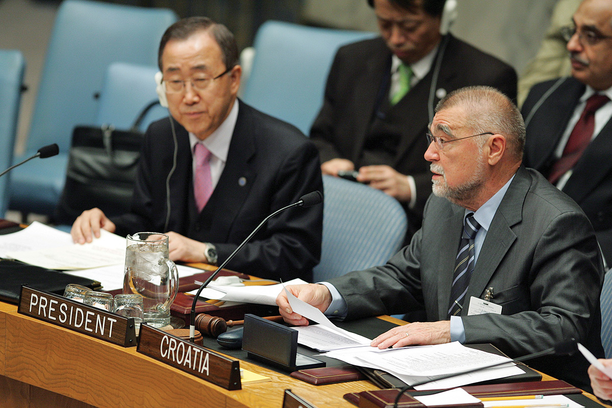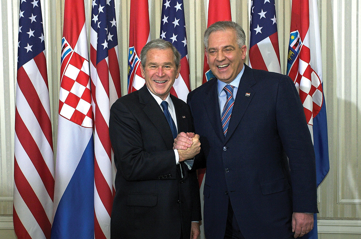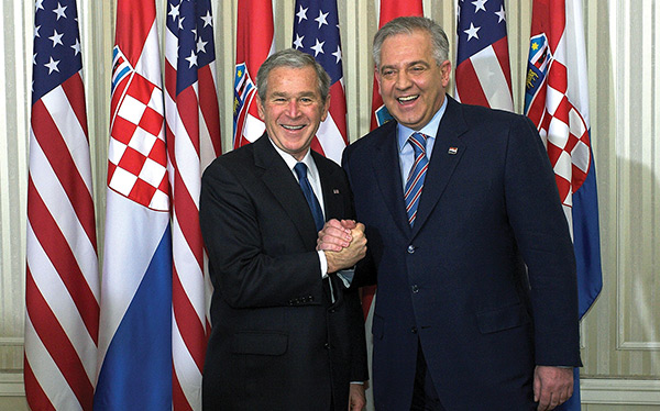 Au lendemain du Sommet de l'OTAN de Bucarest, où la Croatie a été officiellement invitée à rejoindre l'Alliance, le président Bush effectue en Croatie une visite officielle, la première d'un chef d'État américain, mis à part les brèves visites de Richard Nixon à Zagreb en 1970 et celle de Bill Clinton en 1996. À l'occasion de son allocution place Saint-Marc, le président Bush a rendu hommage aux Croates pour les réformes accomplies et déclaré que l'histoire de la Croatie était le meilleur des témoignages que la liberté n'avait pas de prix et méritait tous les sacrifices. Sur la photo : George W. Bush et le Premier ministre croate Ivo Sanader.