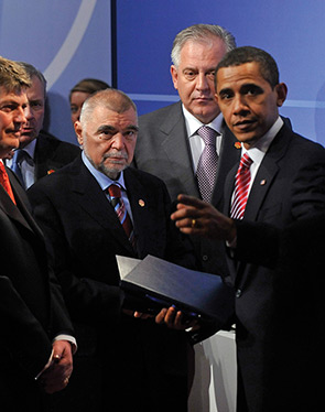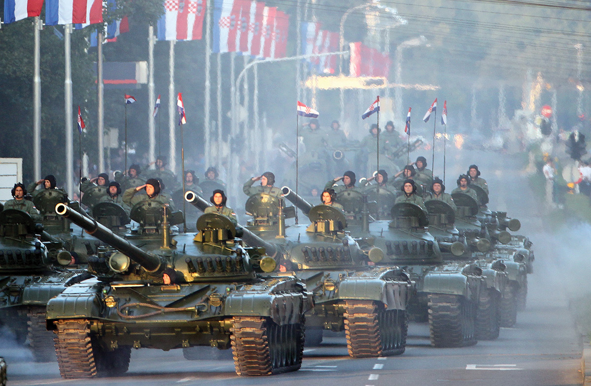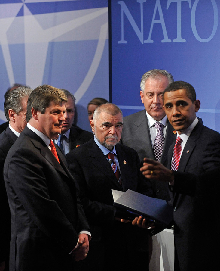Après être devenue membre du Partenariat pour la Paix en 2000, première étape vers l'adhésion, puis avoir rejoint le Plan d'action pour la paix en 2002, la Croatie a conclu le premier round de négociations en avril 2008. Au terme du processus de ratification du protocole d'adhésion signé en juillet 2008 à Bruxelles, la Croatie est officiellement devenue membre de l'OTAN, la plus puissante alliance militaire de l'histoire. Ici, le président croate Stjepan Mesić et son homologue américain, Barack Obama. À l'arrière-plan, le Premier ministre croate Ivo Sanader.